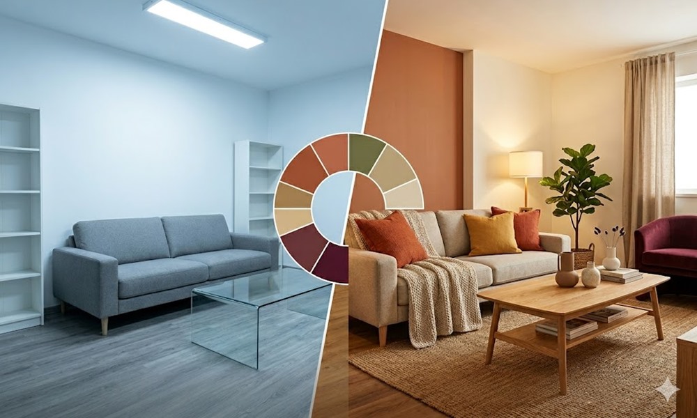 7–9. perc: párosítás. Tarts oda egy párnát/függöny anyagot + egy fa mintát (vagy bármit, ami a bútorok színe). Ha hirtelen „orvosi” lesz: a szín nem rossz, csak rossz környezetben van.