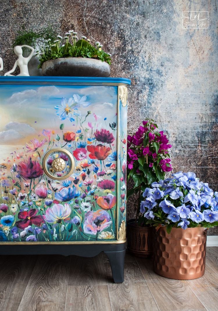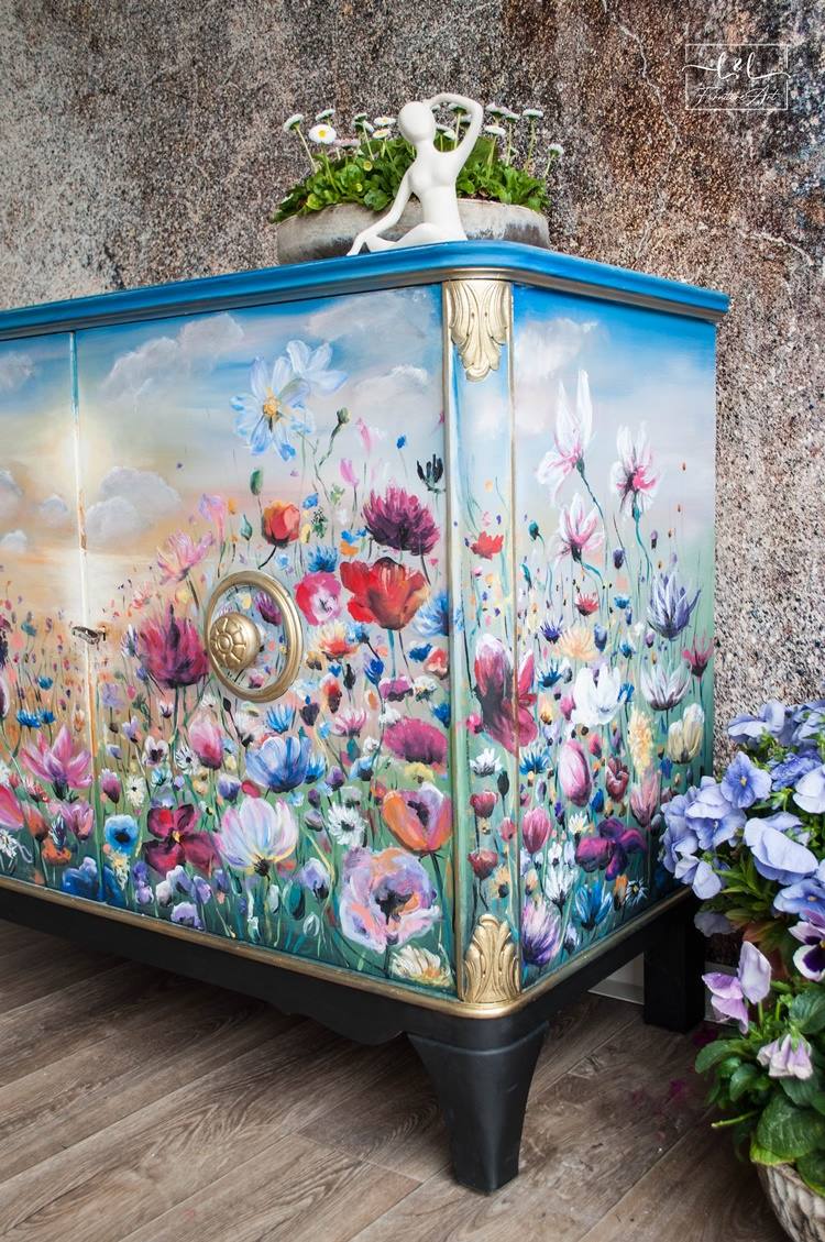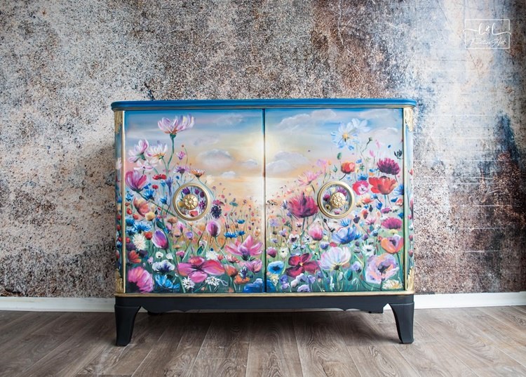 Először is keresnem kellett egy megfelelő komódot. Kétféle típusú komódot szeretek festeni: antikot és retrót. A virágmezőt antik bútorra akartam festeni.