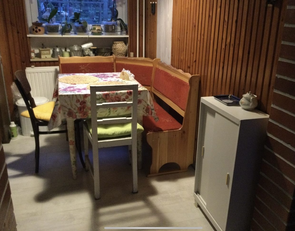 A konyha másik oldalán álló sarokpadból egy kisebbet kerestem a hirdetésekben, melyre rá is bukkantam. Nem ‘féltem’ a színétől, mert bíztam magamban, hogy képes vagyok az átkárpitozására. Elképzeléseim szerint tudtam megvalósítani két délután alatt. Vettem hozzá tűt, szivacsot, és bútorszövetet. Rajzolni kellett, kivágni, majd figyelni az anyag ideális megfeszítésére.