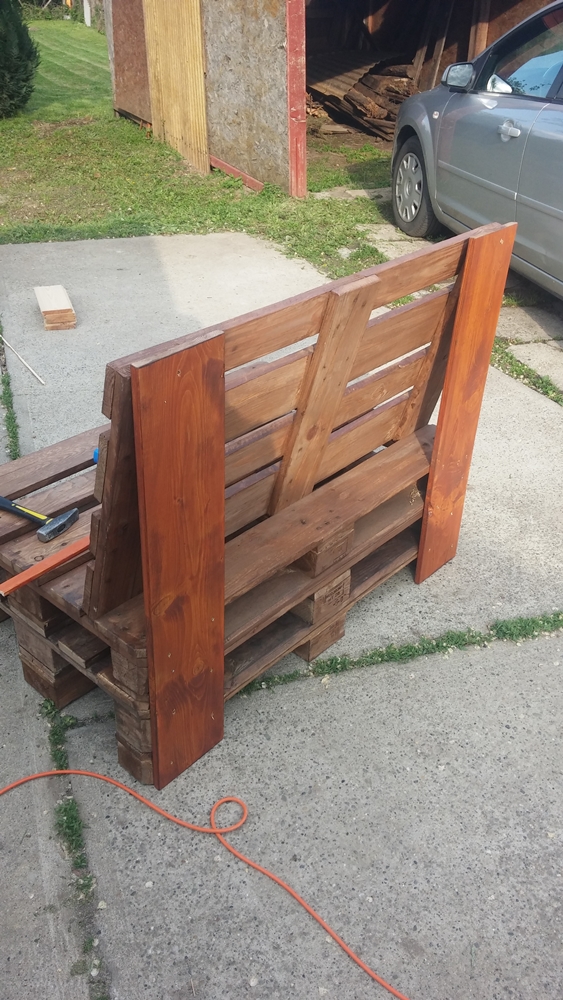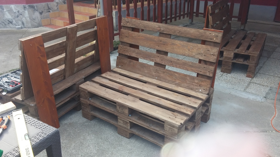 Folyamatos munkával és beszerzésekkel együtt nagyjából 1 hét volt, mire elkészült. Legtöbb időt a raklapok csiszolása, lazúrozása vette el.