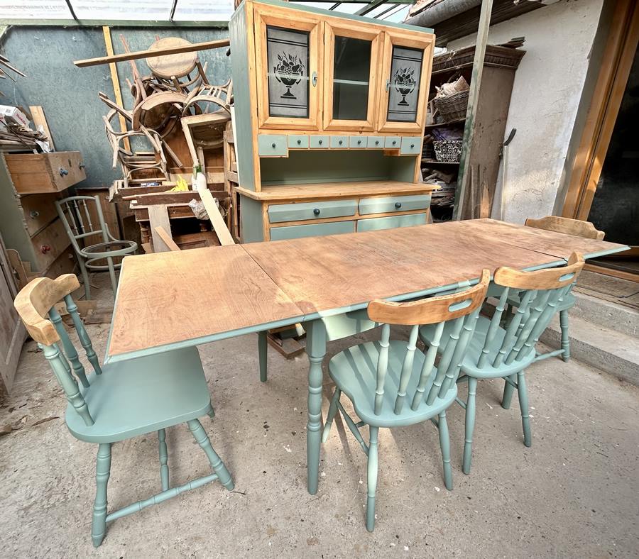 A kredenc és az asztal a székekkel körülbelül egy havi munka volt. A költség (a bútorok ára, csiszolópapír, javításhoz használt anyagok, festék, wax, fogantyúk…) nagyjából 90-100 000 Ft volt.